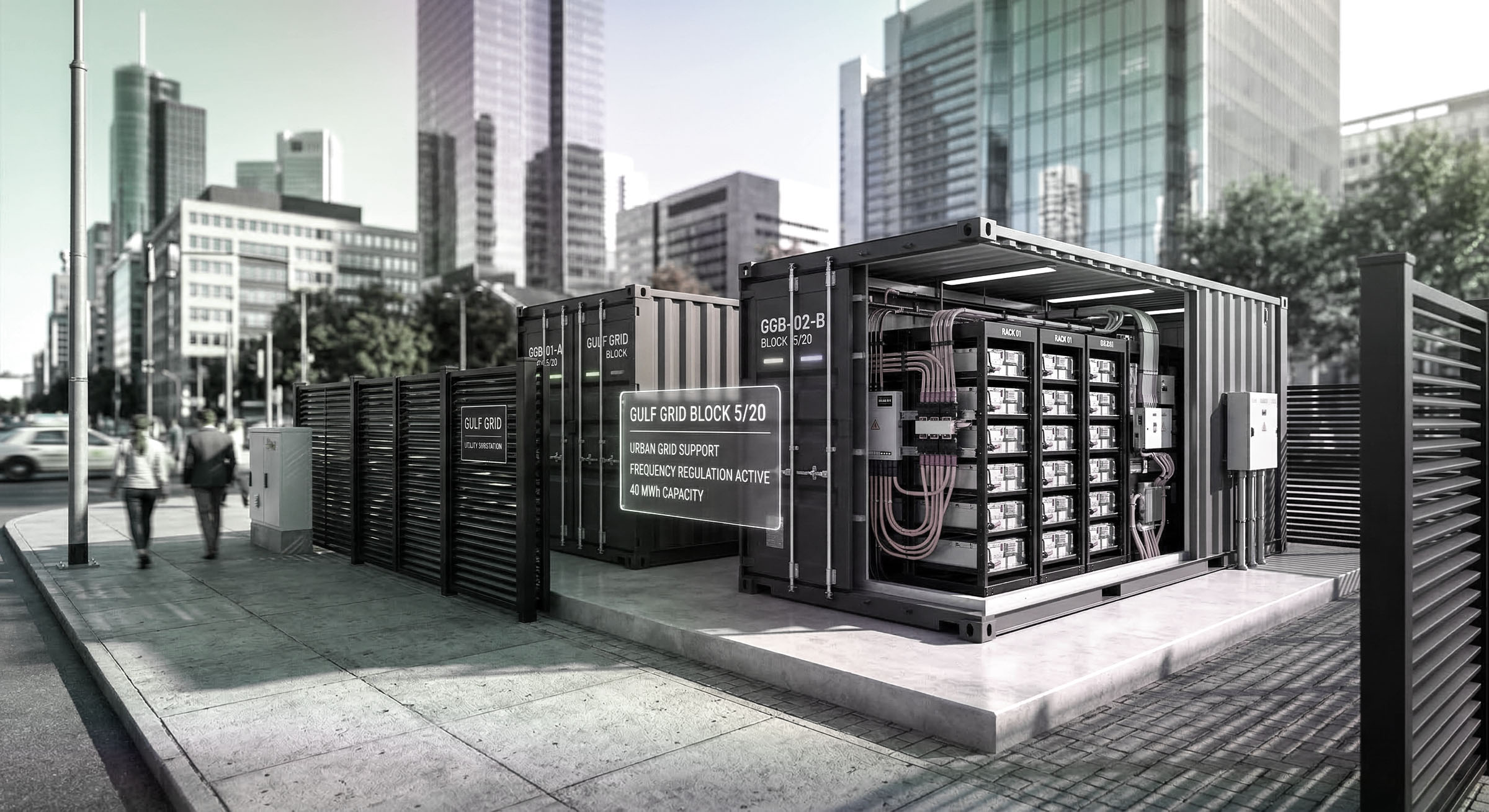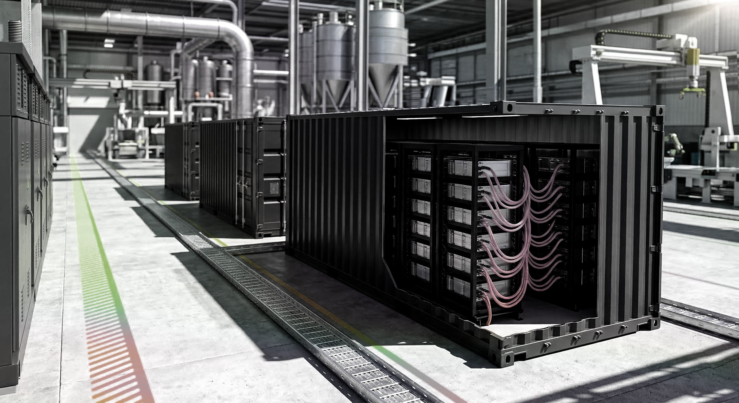20-ft ISO high-cube containers and internal subsystems (racks, DC buswork, auxiliaries, controls mounting).